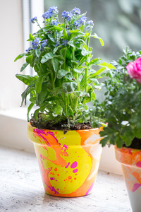 Habt Ihr schon einmal etwas marmoriert? Dann wisst ihr um den Suchtfaktor, den es auslöst. Beim Marmorieren tropft man eine ölhaltige Flüssigkeit in ein Wasserbad, wo sie sich als hauchdünner Farbfilm auf der Wasseroberfläche verteilt. Taucht man nun Gegenstände in das Wasserbad, wird die Farbe übertragen. So entstehen faszinierende, zufällige Musterungen. Klingt einfach und genauso ist es. Probiert es einmal aus z.B. mit unseren wunderschönen marmorierten Blumentöpfen. Wir sind begeistert!