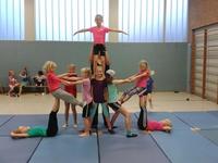 In dem Akrobatikkurs für Kinder werden Pyramiden gebaut und einfache turnerische Elemente wie Handstand und Rad erlernt. Körperbeherrschung, Sensibilität, Gleichgewicht und Ausdauer werden hier spielerisch geschult. Dabei steht die intensive Zusammenarbeit in der Gruppe immer wieder im Vordergrund, da die Kinder sich beim Tragen und Getragen-Werden, beim Halten und Gehalten-Werden aufeinander verlassen müssen.